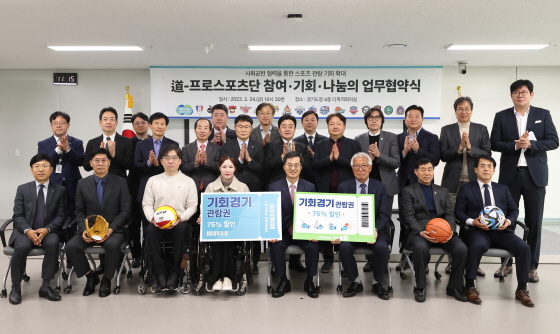 김동연 경기도지사와 도내 연고 18개 프로스포츠단 단장은 도민 스포츠 관람 기회를 확대하고 도민 스포츠 기본권을 높이기 위해 24일 경기도청 상황실에서 ‘도-프로스포츠단 참여, 기회, 나눔의 업무협약’을 체결했다.