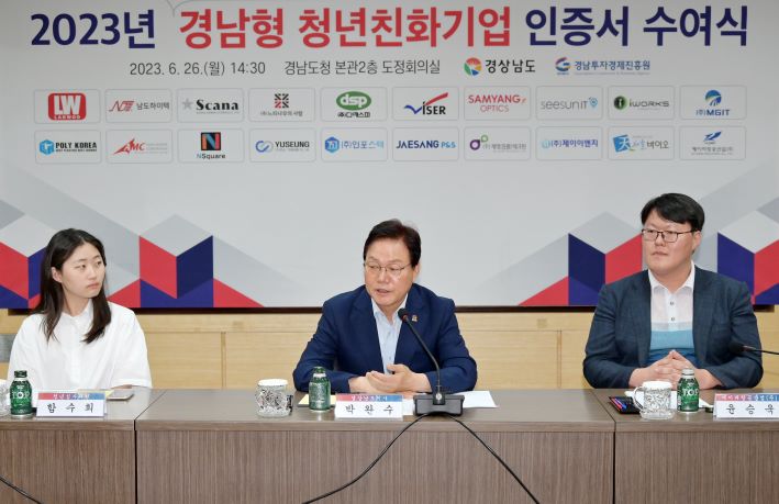 경남도(도지사 박완수)는 26일 오후 도정회의실에서 ‘2023년 경남형 청년친화기업’으로 선정된 20개 기업에 인증서를 수여했다.