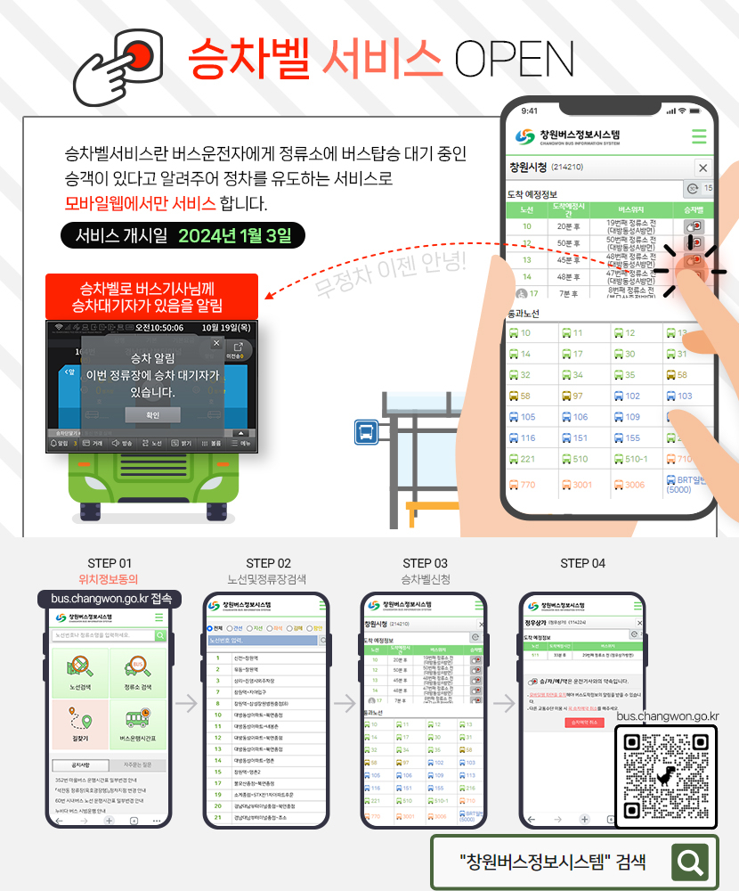 창원특례시(시장 홍남표)는 1월 3일부터 승차 예약정보를 버스 운전자에게 알려주는 창원시 버스정보시스템(BIS) 승차 벨 서비스를 시행한다고 밝혔다.