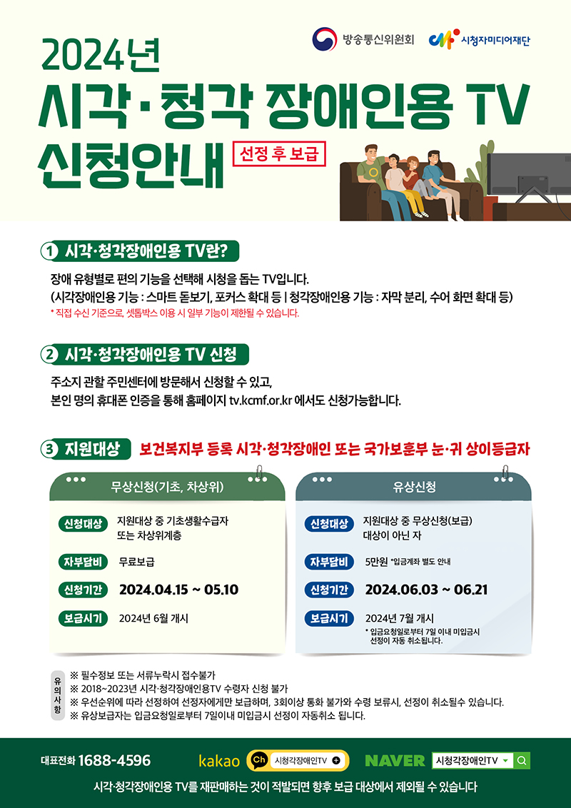 맞춤형 TV는 주민등록지 관할 읍·면·동 주민센터를 방문해 신청하거나 시청자미디어재단 시각·청각장애인용TV 보급 전용 누리집(tv.kcmf.or.kr)에서 온라인으로 신청할 수 있다.