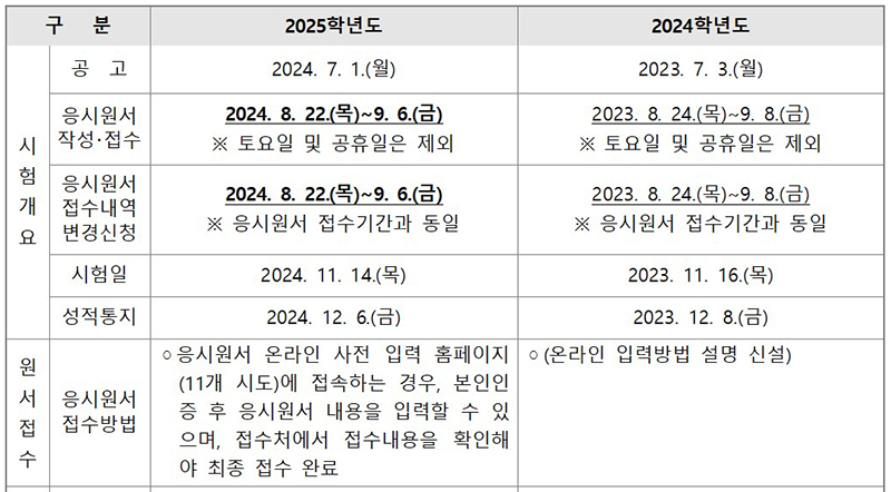 이번 대학수학능력시험 응시원서 접수기간은 다음 달 22일부터 9월 6일까지 12일 동안이며, 응시원서 접수기간 동안 접수내역 변경이 가능하다.