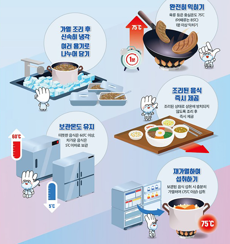 또한 조리된 음식은 가급적 2시간 이내에 섭취하고 보관한 음식은 75℃ 이상으로 재가열해 섭취해야 한다.