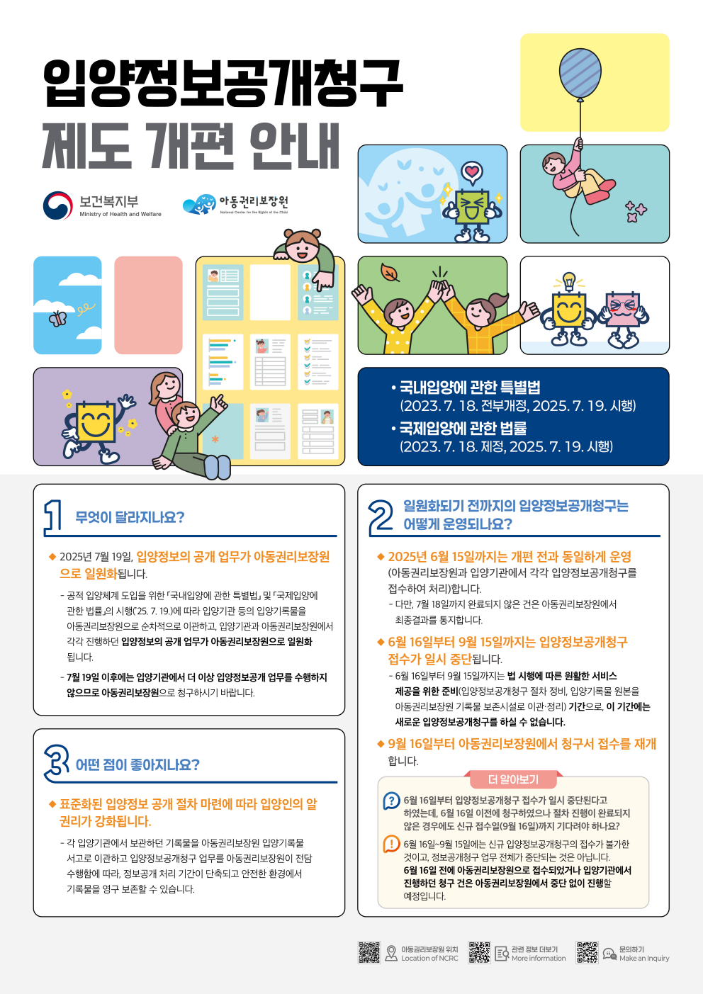 입양인의 알 권리 강화를 위해 모든 입양기록물 관리와 입양 관련 정보공개 업무는 아동권리보장원으로 일원화된다. 이를 위해 아동권리보장원은 입양기관 등이 보관하고 있는 기록물을 안전하게 이관하는 작업을 착수했으며, 새로운 절차에 따른 정보공개청구 신청은 9.16일부터 재개될 예정이다.